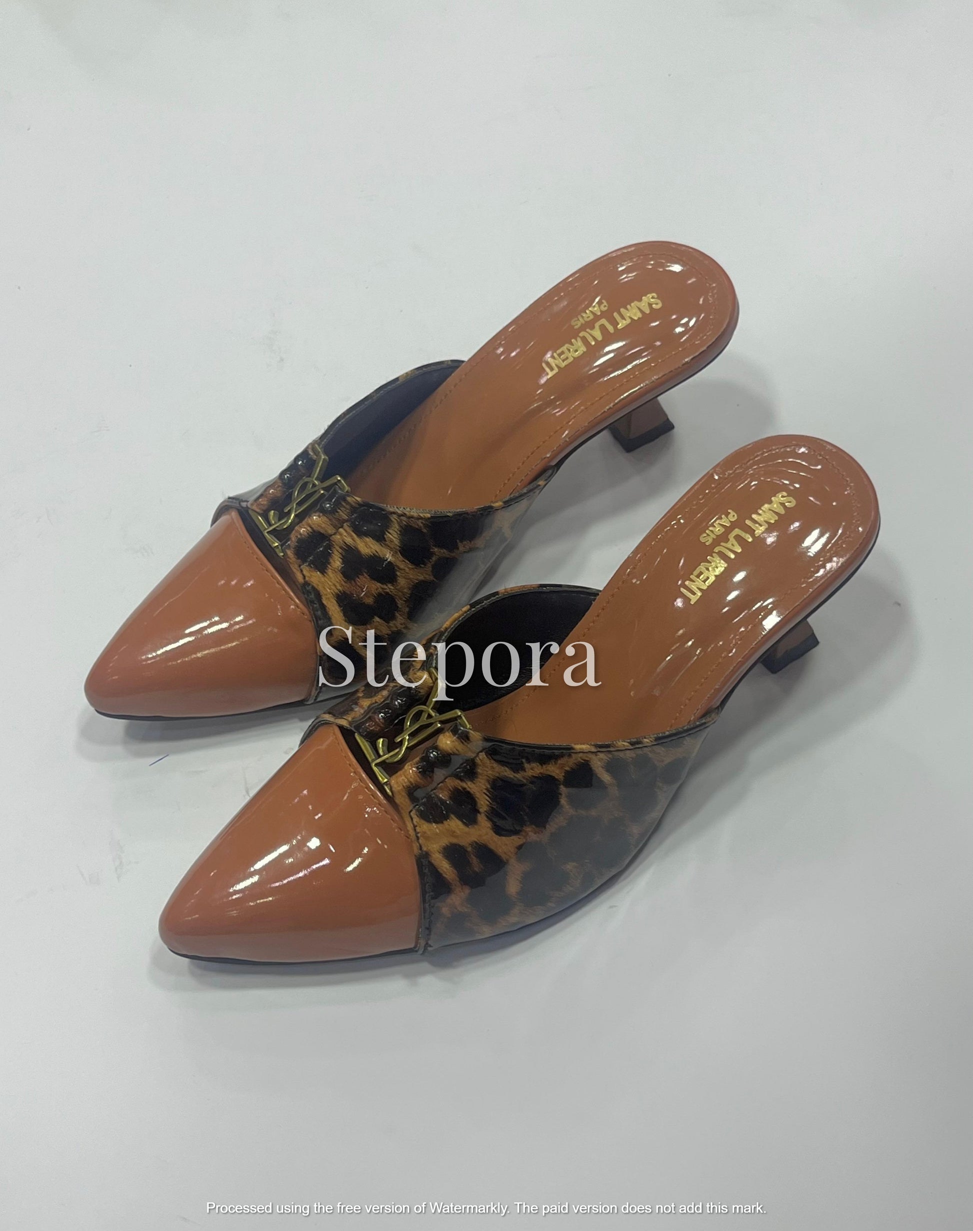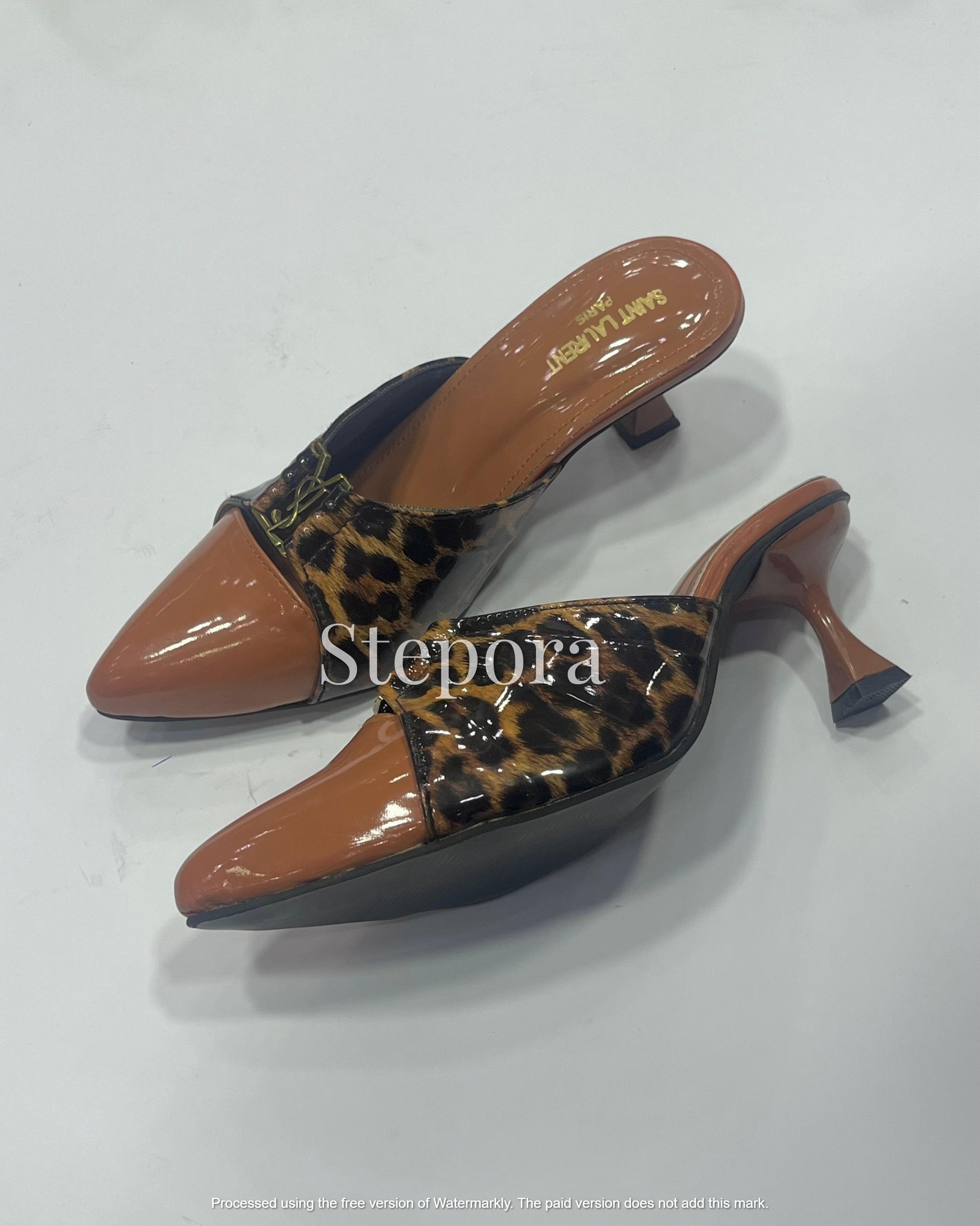 Make a bold statement with these luxurious pointed-toe mules featuring a striking combination of leopard animal print and sleek patent finishes. Each pair is detailed with a sophisticated gold-tone metal emblem at the vamp, adding a high-fashion touch to the slip-on silhouette. Designed with a stable, architectural low kitten heel and a cushioned footbed, these slides offer a perfect balance of comfort and trend-setting style. Whether paired with tailored trousers or an evening dress, these exotic print heels are the ultimate power accessory.