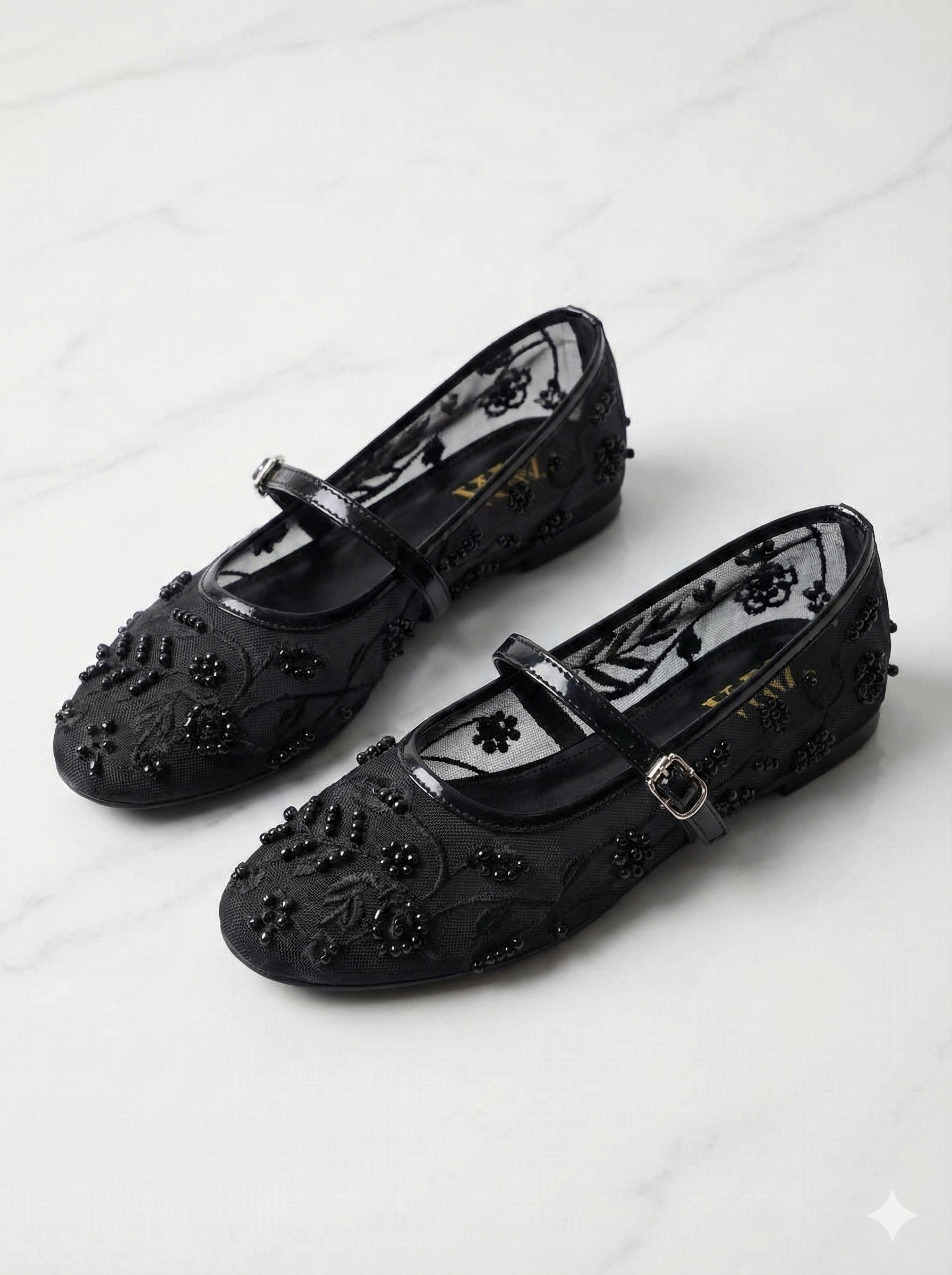 Elevate your footwear collection with these exquisite Pearl Embellished Mesh Mary Jane Flats. Designed for the modern romantic, these ballet pumps blend the timeless silhouette of a classic Mary Jane with contemporary sheer trends. Perfect for weddings, garden parties, or adding a touch of sophistication to your daily attire.