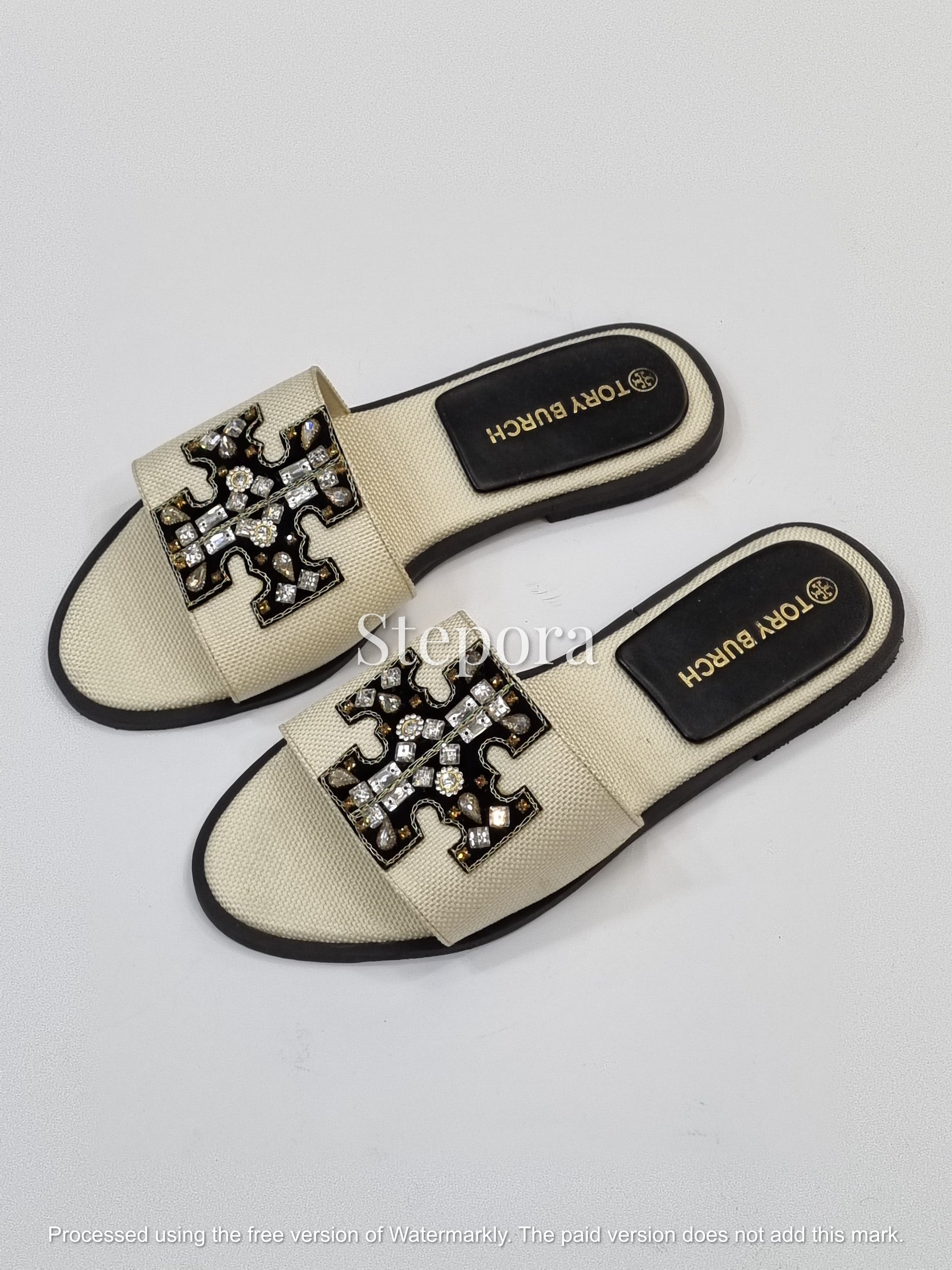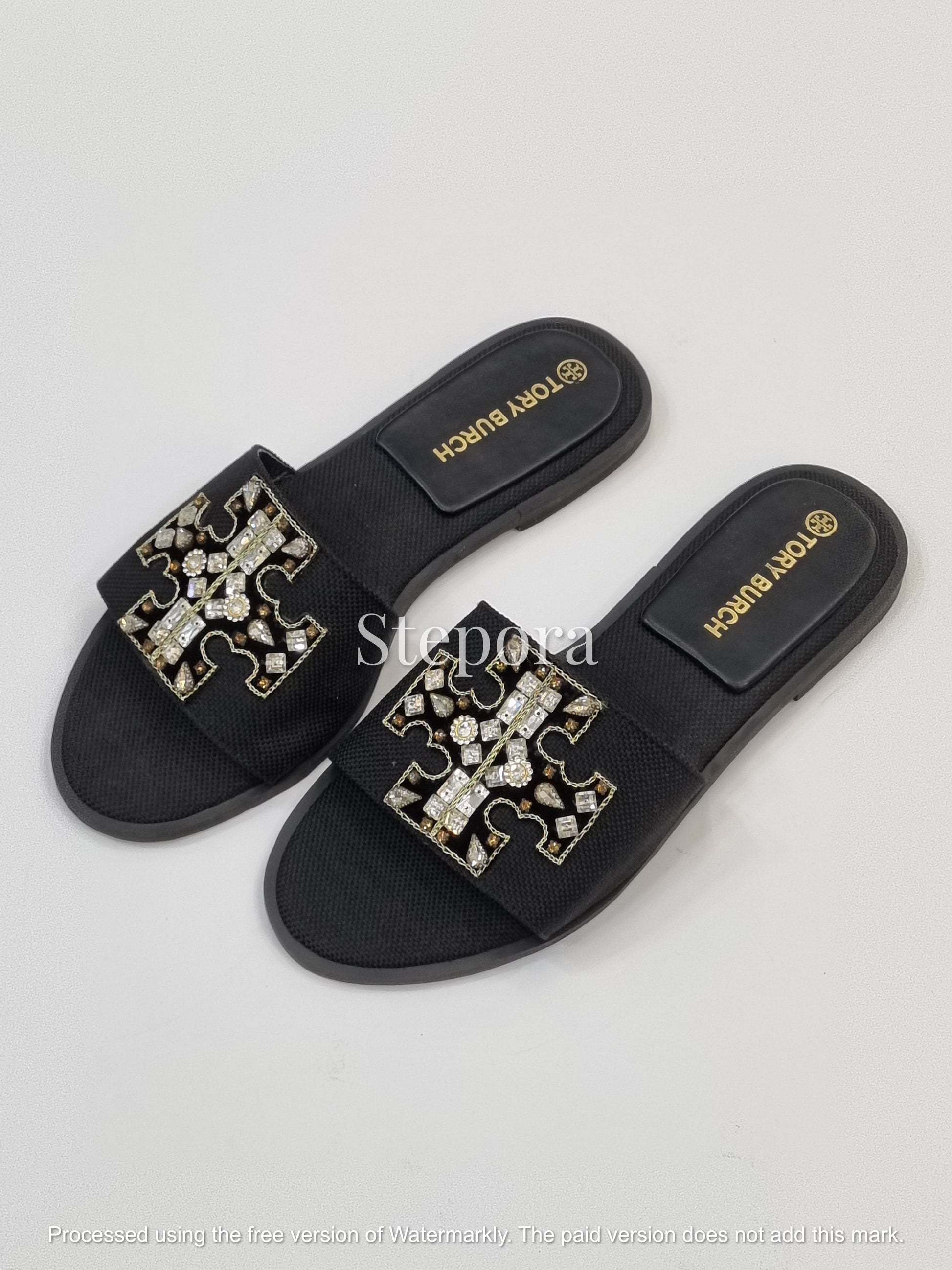 Add a touch of sparkle to your everyday look with these stunning rhinestone-embellished slides. Featuring a wide, textured fabric strap adorned with a crystal-encrusted geometric cutout, these flats offer a luxurious designer-inspired aesthetic. The easy slip-on design and comfortable flat sole make them perfect for both casual outings and dressy summer events.